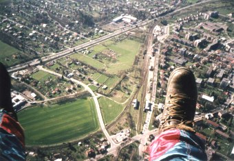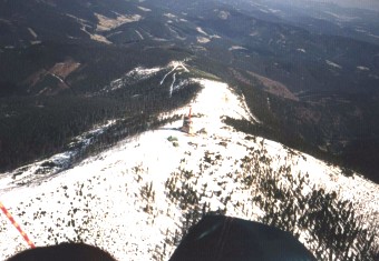 Dál už jsem letět nechtěl, a tak jsem přemýšlel, kam přistanu. Když jsem otáčel Lysou, tak pár padáčků zkoušelo přeskok zpátky na Smrk, ale skončili někde v údolí. Tak jsem se rozhodl, že přistanu ve Frýdlantu. Bylo to míň proti větru a pro mého nijak rychlého Limita přeci jen dosažitelnější. A tak zaměřuji nohama stojícíma ve speedu na město. Na posledním brdku dotáčím poslední stoupák, vyfotím naposled Lysou horu za mými zády a přemýšlím, kde v tom městě jenom přistanu?