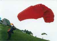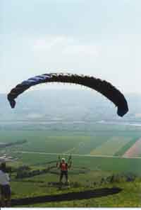 Po okúzľujúco príjemnej noci, strávenej s kolenom veľkosti melónu, išli ostatní na druhý deň lietať a ja, pajdajúc na jednu nohu, som išiel s nimi aspoň ako morálna podpora. Ku koncu dňa sa začalo lietať z polovice hangu a ja som to už nemohol vydržať. Milý priateľ Brumteles mi z auta doniesol sedačku s padákom, pričom mi ich svojím ochotným chrbtom totálne prepotil. Aj tak mu za to patrí moja vďaka. Osadil som svoju telesnú schránku do sedačky, Juro ma chytil za popruhy a zahodil. Perfekto! Len to pristátie parakotúľom bolo trocha tvrdšie. Druhý pokus z vrcholu Hangu spočiatku nebol až taký OK, lebo som si znovu vyhodil koleno z pántu. Ale keďže mi nič iné ako zletieť neostávalo, po krátkom intermezze, kedy som vyslovil všetky sprosté slová, na ktoré som si v tej chvíli spomenul, opäť som s pomocou Jura vzlietol, zabudol na koleno a nádherne mäkko pristál na hubu v dvojmetrovej žihľave. Nádherný deň, všetci sme boli absolútne happy.