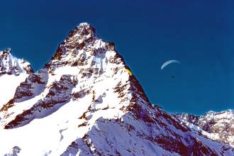 S tímto vědomím člověk létá přece jenom trochu opatrněji. Je tedy možné letět buď na šest kilometrů vzdálený alpinistický tábor, nebo hlavním údolím, které vede až do rovin před Kavkazem a je v něm silnice. Počasí však s naším tréninkem spolupracovalo jen jeden den. Startovali jsme z 2500m n.m a nad příkrými stráněmi pokrytými sněhem chodily stoupáky okolo tří, čtyř metrů za sekundu až do výšky 3200m n.m. Přistát nás donutila až po dvou hodinách zima.