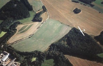 Kumuly se úplně vytratily. Když potřebuji najít stoupák, letím v předkonu a s očima upřenýma pod sebe sleduji každý detail na zemi i ve vzduchu a usilovně přemýšlím, kde zrovna teď může nějaký ten stoupáček být. Naštěstí se mi daří a cesta rychle ubíhá. Ke konci letu šlapu do speedu co to dá, přece jen už je konec srpna a před pátou je už slunce pěkně nízko nad obzorem. Posledních 10 kilometrů se držím ve vzduchu jen silou vůle, termika je zvadlá a potrhaná sílícím JV větrem, připadá mi, že svahuju nad stromy.