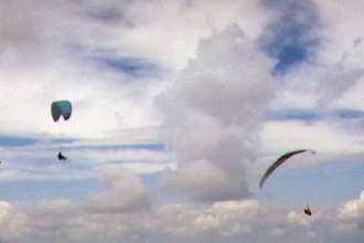 Přiletěl jsem na úroveň Lovosic a zase jsem měl 200m nad zemí. Spoléhal jsem se na svoji šťastnou hvězdu a nad nějakou vískou znenadání ucítil pach vepřína, který byl dole pode mnou. Je to jasné - stoupák. Když jsem jej našel, zase jsem si trochu pomohl, ale velká sláva to nebyla. Přeskočil jsem k další vesnici, kde byla velká a už pokosená obilná pole a zrovna vysvitlo sluníčko. To byste nevěřili, co jsem zažil. Nad polem něco brblalo, padák se ležérně kýval, kroužil jsem snad deset minut a velice zvolna ztrácel výšku. Výškoměr ukazoval -50m, protože jsem přiletěl do hlubokých nížin. | Pomalu jsem sklesal na úrověň drátů vysokého napětí na sloupech napříč mým polem a najednou jsem vyplašil nějaké další káně, sedící na drátech. Káně párkrát mávlo křídly a hned začalo točit. Posledních pár metrů výšky jsem obětoval na dolet ke káněti - a začal jsem stoupat taky!! Neuvěřitelně jsem se dostal do výšky asi 800m nad zemí, kde stoupání skončilo a mohl jsem přeskočit nad Terezín.