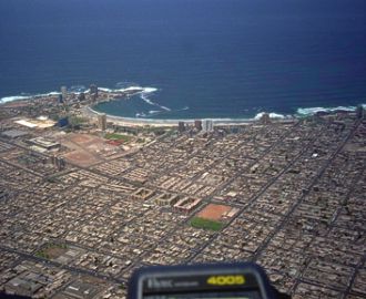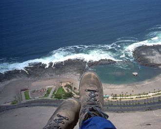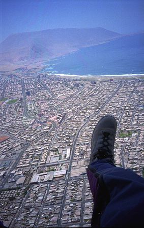 Jednu dobu jsem se octil na pár dní bez svých milých společníků, nicméně mi přálo štěstí, protože jsem narazil na skupinu 8 švýcarských turistů, trávících vánoční svátky se svými padákovými miláčky právě v Iquique. Spřátelili jsme se brzy (slunce, moře, padáky, dovolená… to dělá své) a společně jsme nějakých pár hodin nalétali. Start je ve výšce asi 500m, přistání na pláži. Létá se hlavně v termice, která je docela přijatelná - největší stoupáky byly kolem 5m/s. Na startovačku Alto Hospicio vás dopraví taxi (v přepočtu asi za 60,- Kč, což na cestu zhruba 15km není špatné). Nejprve musíte vystoupat 50-80m, přeskočit na další písečný svah, zase vytočit, přeskočit a tak podobně pokračovat 3-4km a pak máte pod sebou celé stopadesátitisícové město.