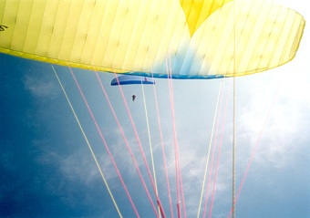 To mě přivádí k úvaze o dalším cíli mého poletování. Vozit se pod mraky je krása, ale tohle krásné počasí bych měl přece pořádně využít. V životě jsem pořádný přelet neletěl, ale dnes je ten den. Svůj dnešní let si musím ještě dlouho pamatovat. Údolí se stejně začíná dekovat souvislou vrstvou termických mraků, dá se čekat, že nejbližší půlhodinka bude slabší. Nejsem v ideální poloze - ještě asi kilometr bych se mohl před přeskokem posunout šikmo po hřebeni a zkrátit tak přeskok o pár set metrů. Ale tam zrovna není žádný mrak, který by ukazoval, že bych tam mohl nějakou výšku dobrat. Jsem nad údolím, mám 1700 a těsně pod základnama slabších mraků si držím konstantní výšku. To by mohlo dát. Otáčím k západu.