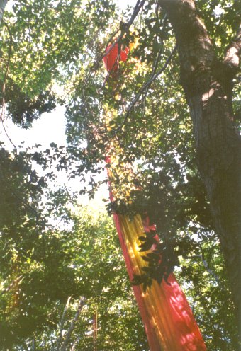 Tak fajn, jsem celý, nezraněný, na zemi uprostřed lesa. Jediné, co mi chybí, je můj Létající koberec, který se houpe v koruně stromu nějakých 10-15 metrů nade mnou. Znovu se vydrápu do větví a snažím se dosáhnout na visící popruhy. Praskavý zvuk pode mnou mi naznačí, že tudy cesta nevede. Bude to chtít pilu. Pomoc by taky nebyla na škodu.