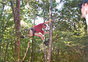 Ve výšce vidím Maxadana, jak se vrací z Lijaku a přeskakuje zpátky na Kovk. Vysílačkou se konečně spojím s klukama, kteří mi vyrážejí na pomoc. Ve výbavě máme lano i sedák. Jediné, co chybí, je dost veliká pila. Sqert, který už má ze svých mnoha předchozích stromových přistání slušně natrénováno, vyběhne na hladký strom jako veverka a jme se pilkou z kapesního nožíku odřezávat větve.