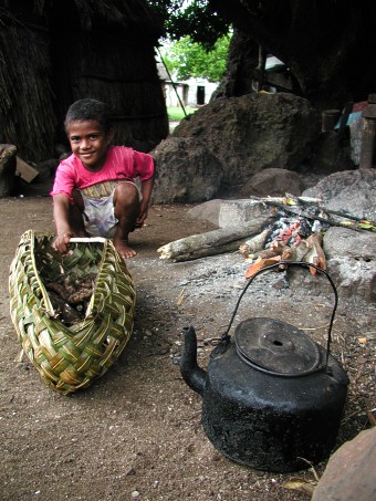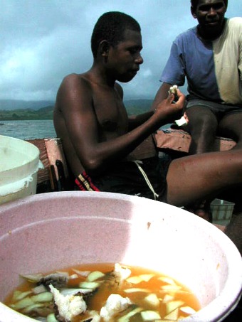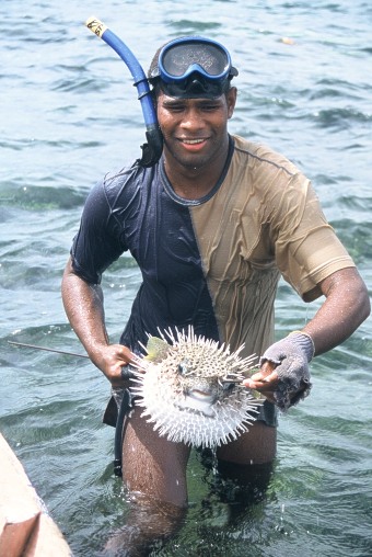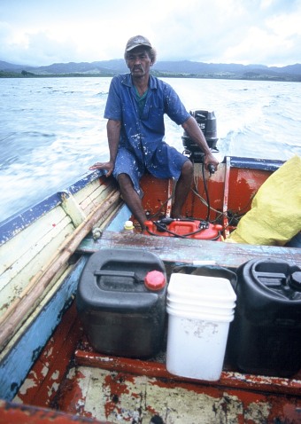 Procházíme mezi dřevěnými bure, původními domy se střechou z palmového listí. Je nám líto, že vesnice je poloprázdná. Zbyly zde jen děti, mladé matky a starci. Ostatní šli hromadně lovit ryby podle starých polynéských způsobů. Stojíce v kruhu nahánějí ryby do palmové sítě. K tomu využívají i jednoduchý vor z bambusových tyčí tzv. bilibili. Z dálky je pozorujeme a vítáme nabídku společného lovu s našimi průvodci. Člověk harpuna a ryby. V Daliborovi propukly lovecké vášně tak silně, že mi drze uloupil brýle i šnorchl a nechal mě napospas žralokům.